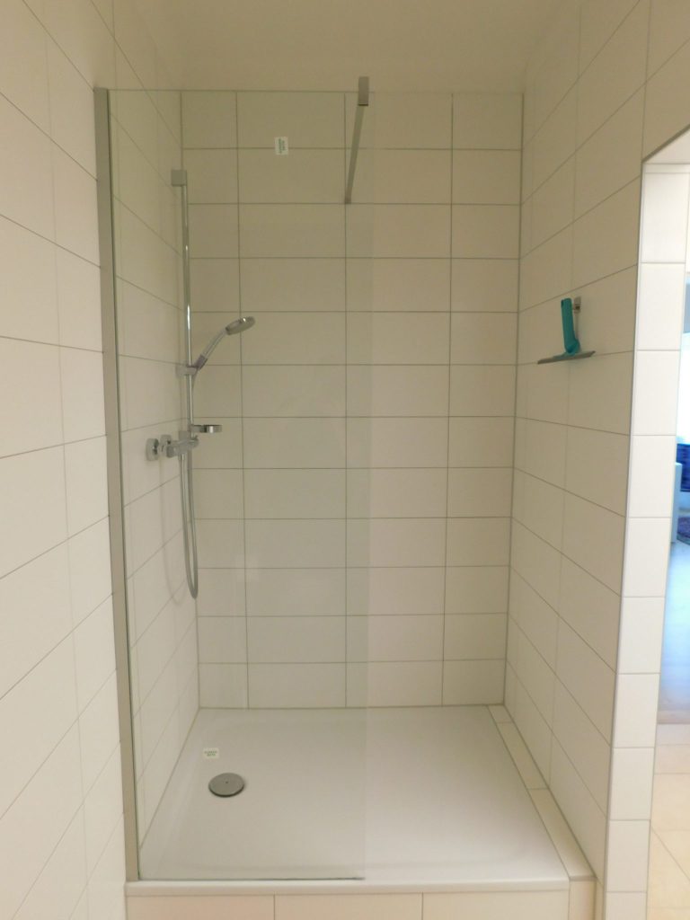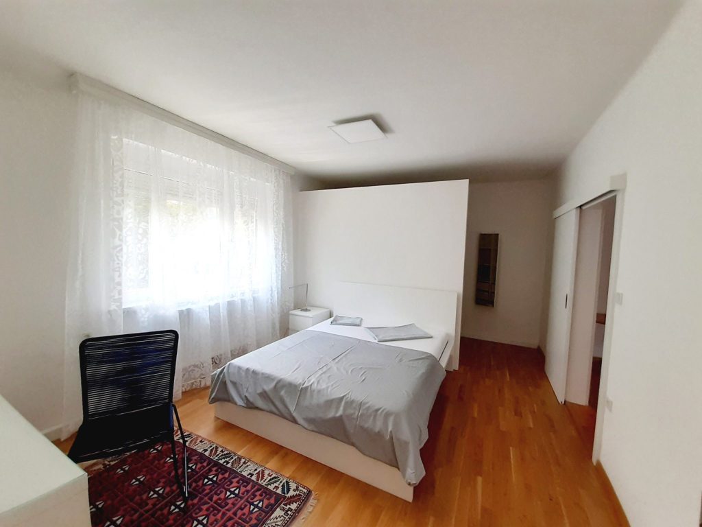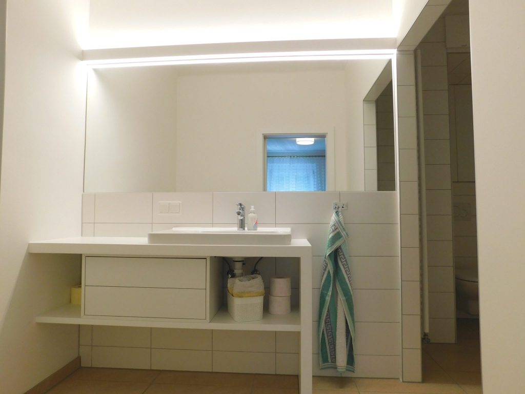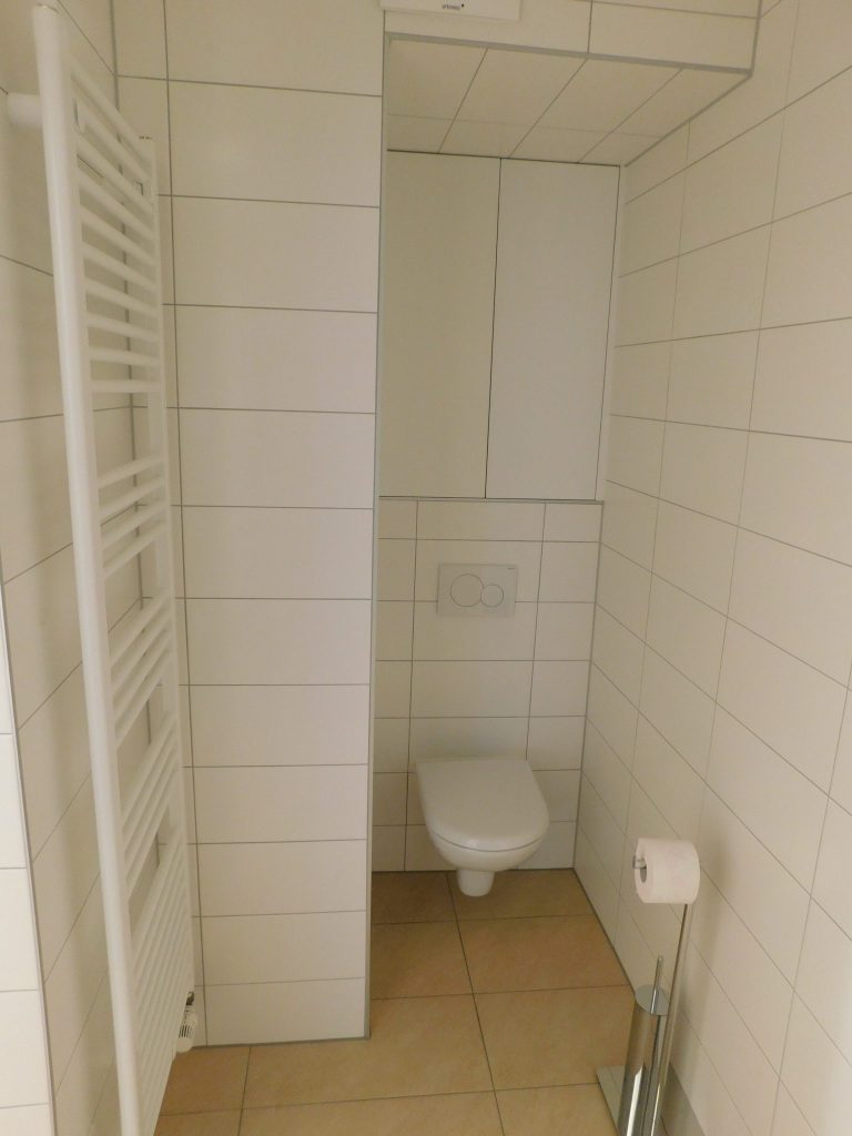 Die im 1. Obergeschoss befindliche Wohnung mit ca. 80 m² verfügt über einen offen gestalteten Eingangsbereich/Garderobenraum bzw. Büro, ein geräumiges Bad mit großer Dusche und WC, eine extra Küche inkl. Einbauschränke/E-Geräte, sowie über ein Schlafzimmer mit Schrankraum und einen großzügigen Wohnbereich.